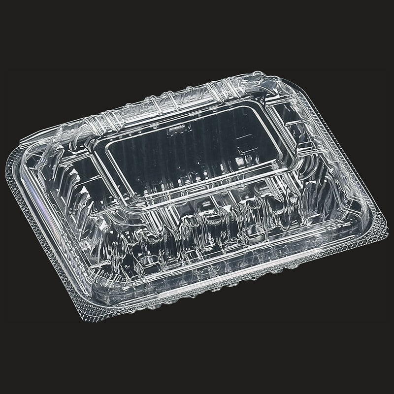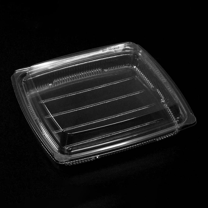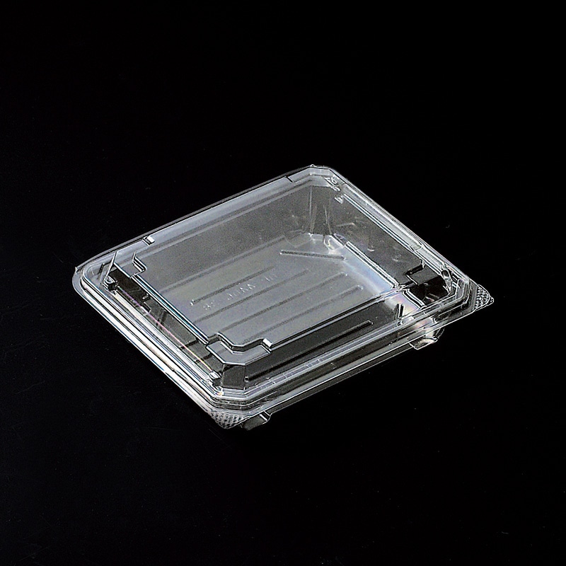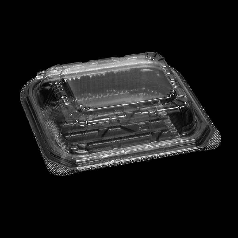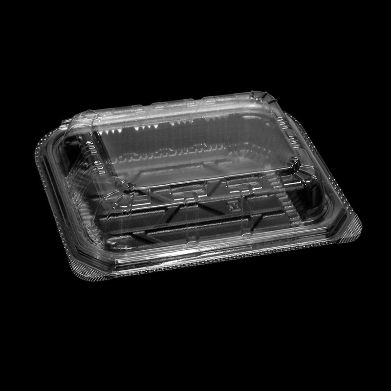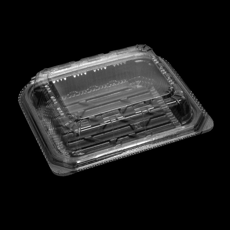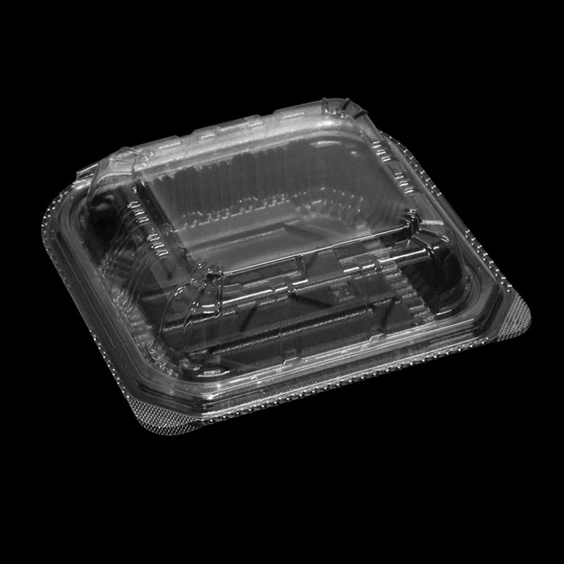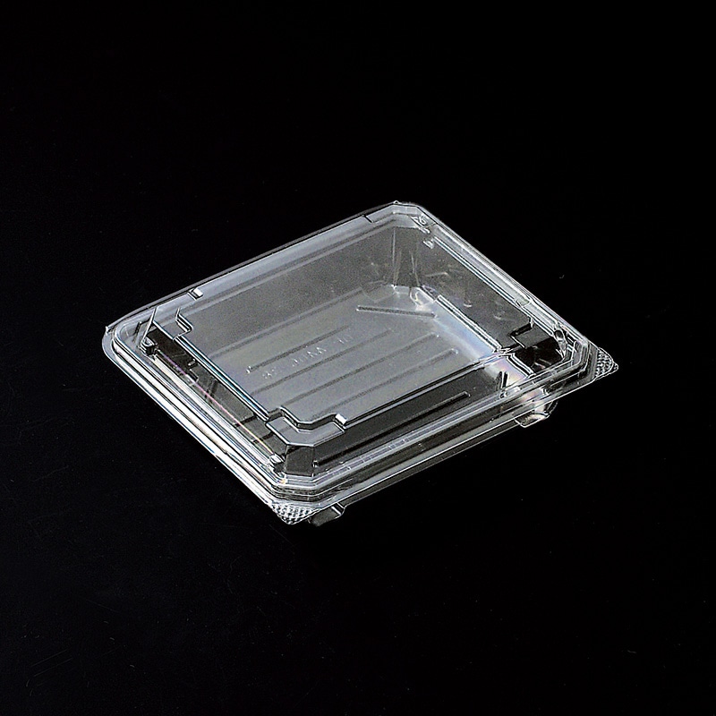 折り蓋式の透明容器です。外嵌合タイプ。広い天面と開けやすいベロで簡単に閉まって作業性良好。コーナーリブによって抜群の強度を保持。段重ねにしっかり対応します。耐油・耐酸性に優れています。●電子レンジ使用不可●耐熱温度:95℃●入数:50枚