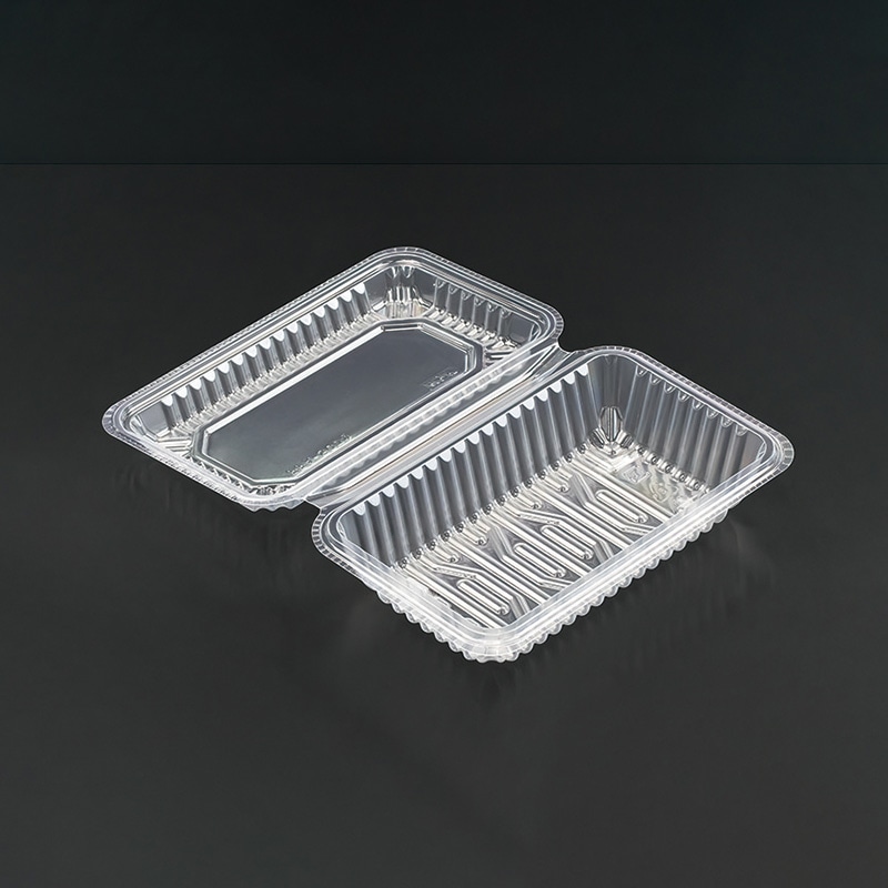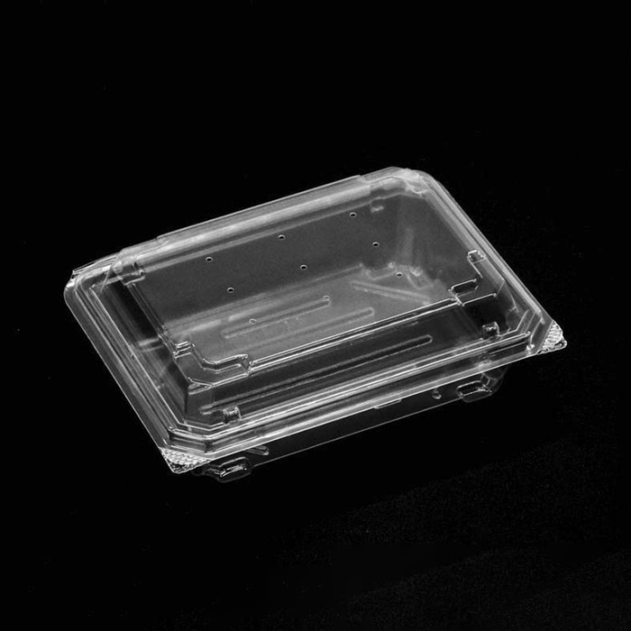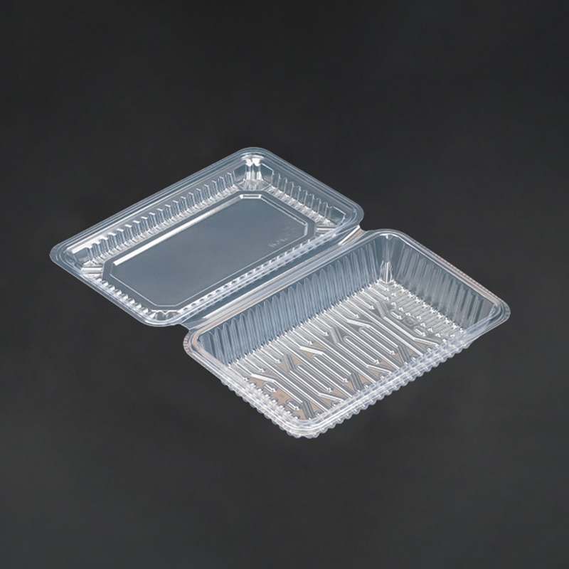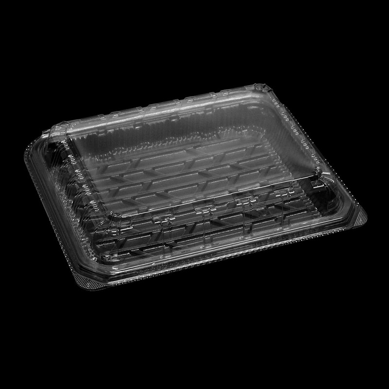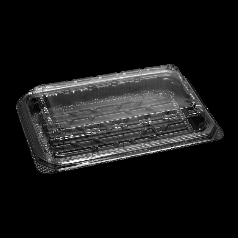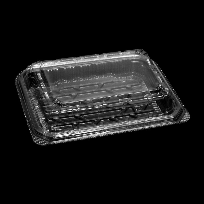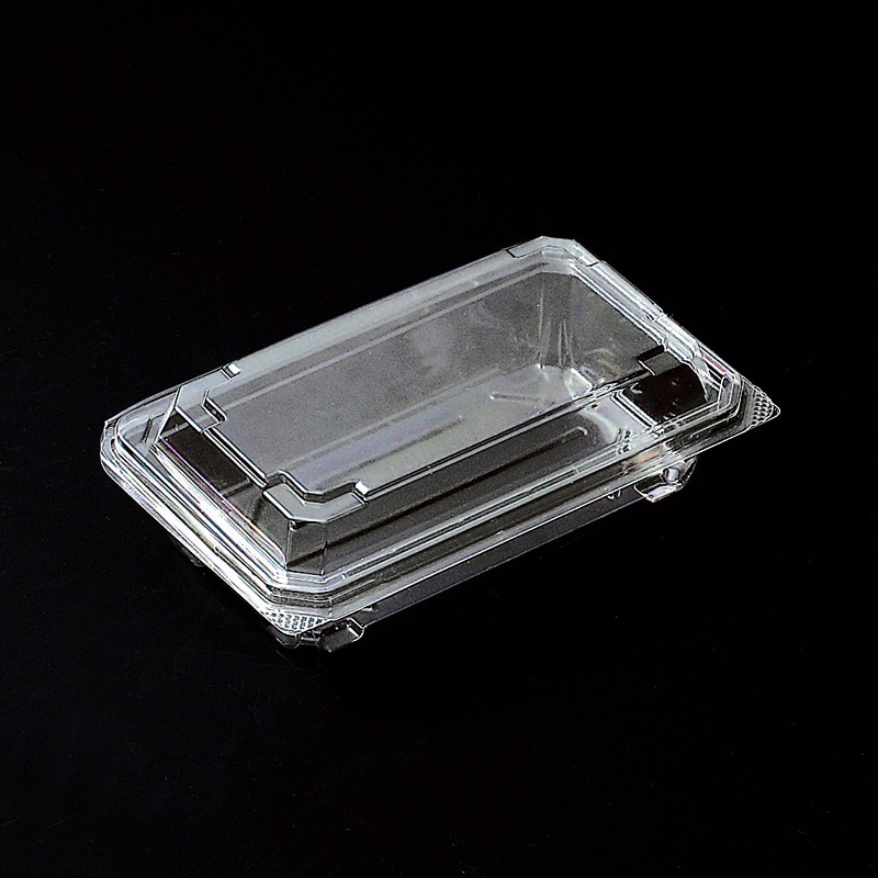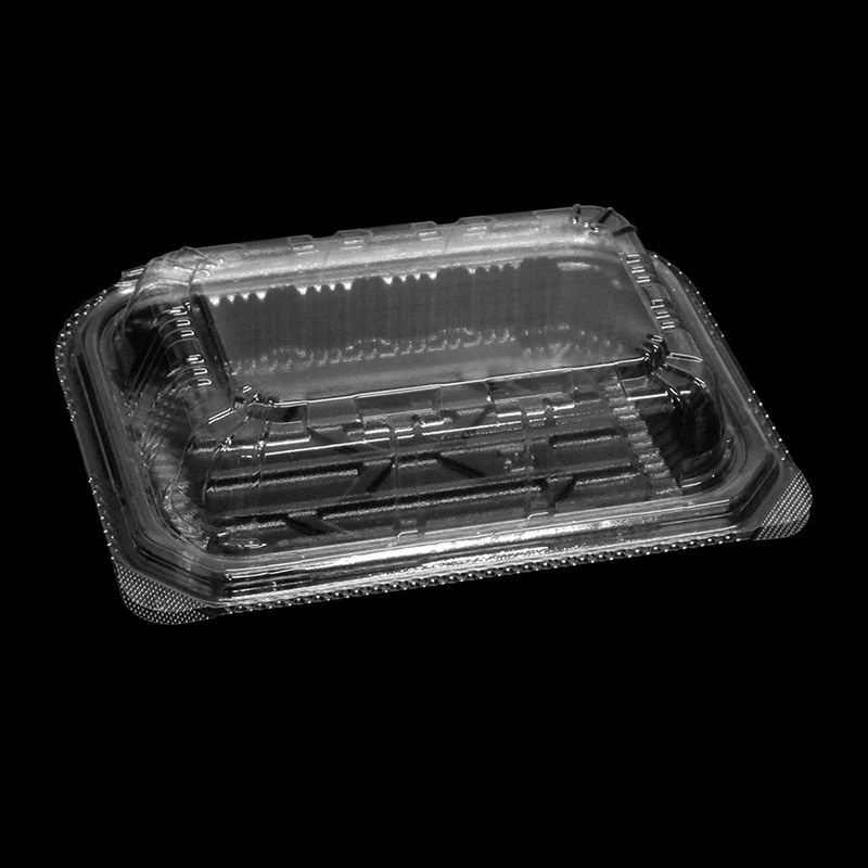 折り蓋式の透明容器です。外嵌合タイプ。広い天面と開けやすいベロで簡単に閉まって作業性良好。コーナーリブによって抜群の強度を保持。段重ねにしっかり対応します。耐油・耐酸性に優れています。●電子レンジ使用不可●耐熱温度:95℃●入数:50枚