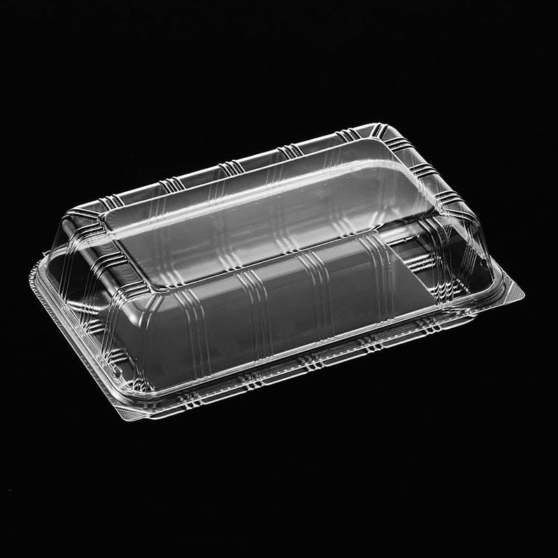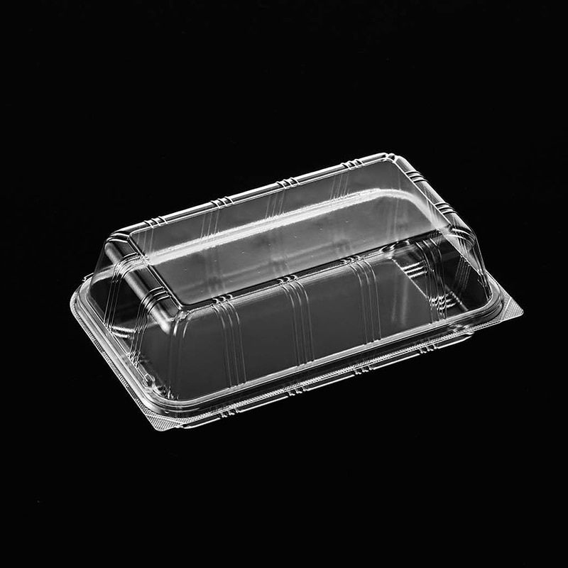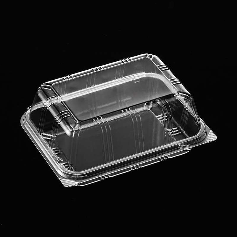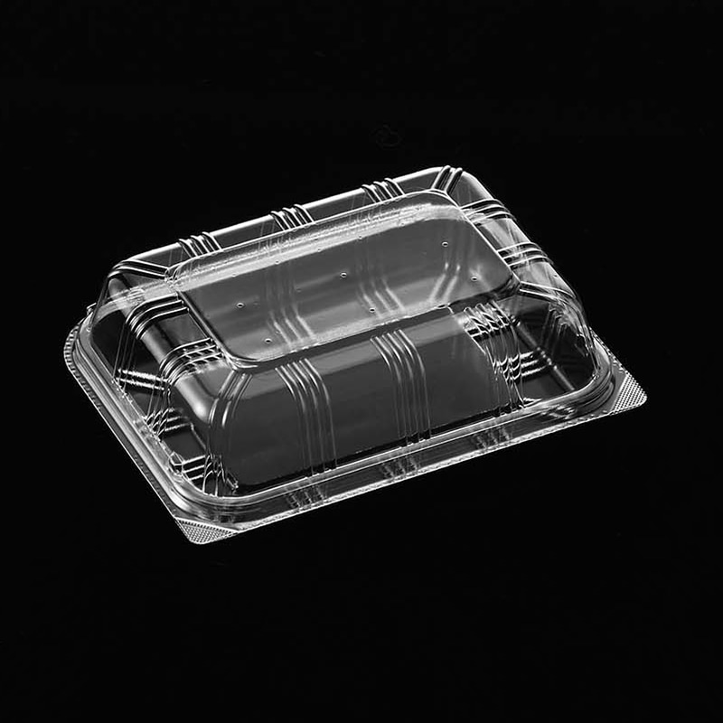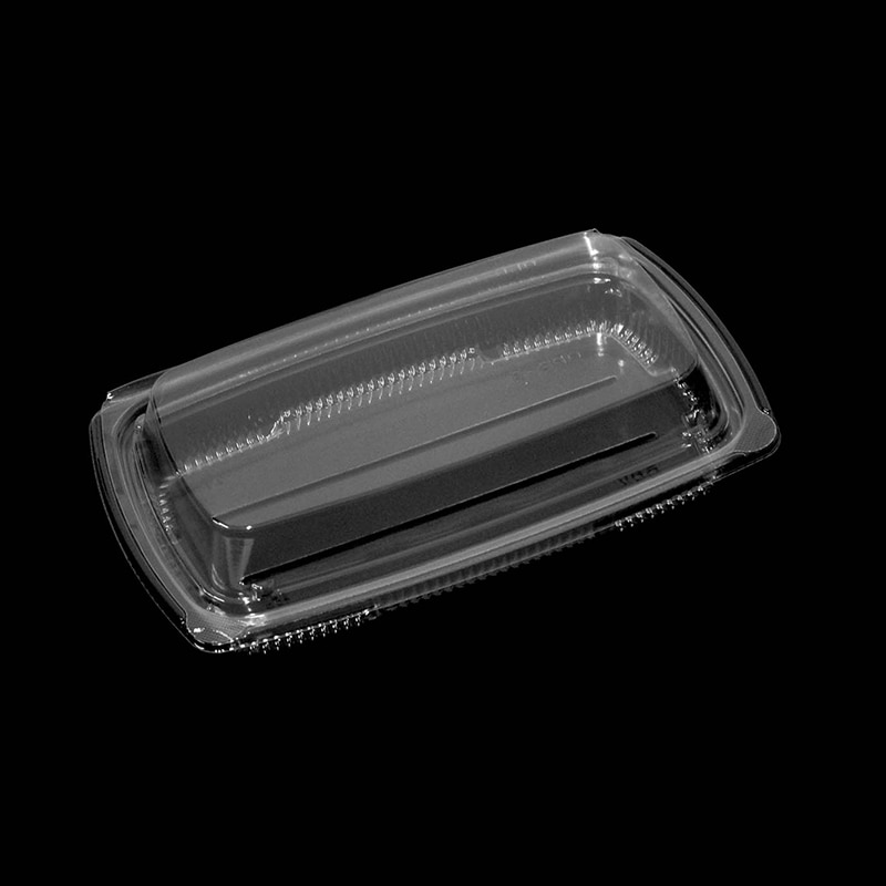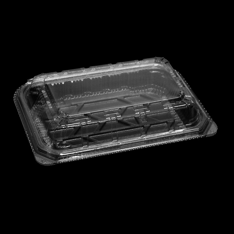 折り蓋式の透明容器です。外嵌合タイプ。高蓋形状で、高さのある食品にピッタリ。中の食品がよく見え、ボリューム感がアップします。耐油・耐酸性に優れています。●電子レンジ使用不可●耐熱温度:95℃●入数:50枚