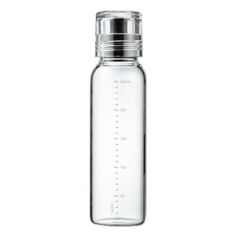 振って・作って・注いで・保存もOK。●振って作るドレッシングやタレのオリジナルレシピ付き。ネジ口密封ボトルなので、振って作って、そのまま保存できます。ボトルは耐熱ガラス製なので、色やにおいがつきにくく、熱湯消毒や食器洗い乾燥機の使用もOKです。●サイズ:幅55×奥行55×高さ203mm●重量:約237g●容量:実用容量=250ml●素材:本体=耐熱ガラス、フタ=PCT樹脂、注ぎ口=シリコーンゴム●生産国:中国
