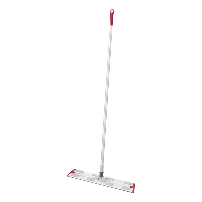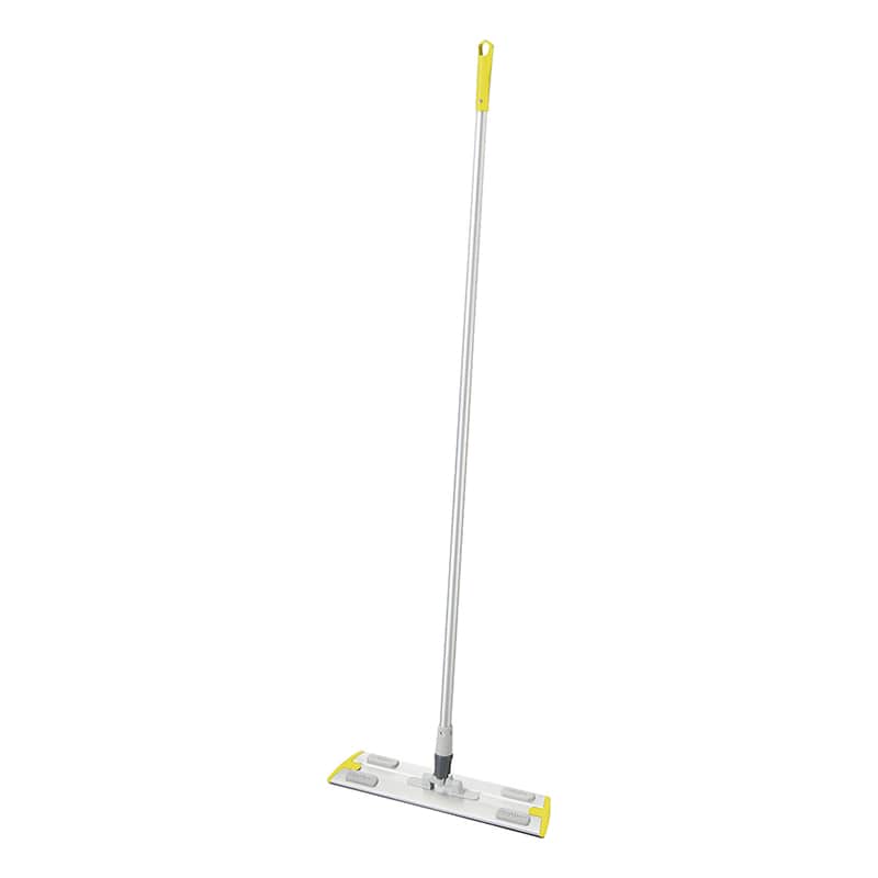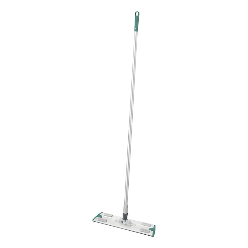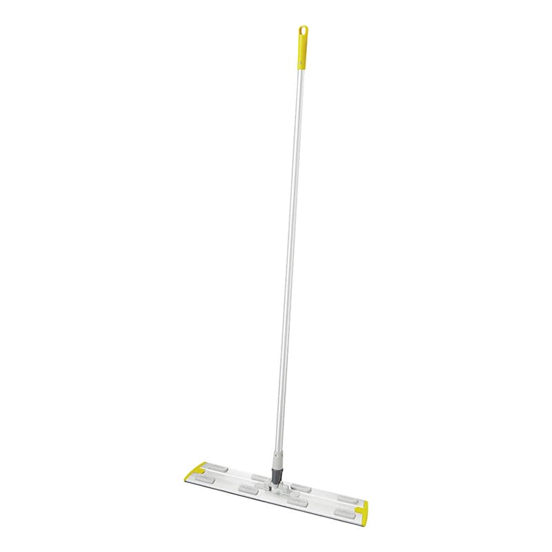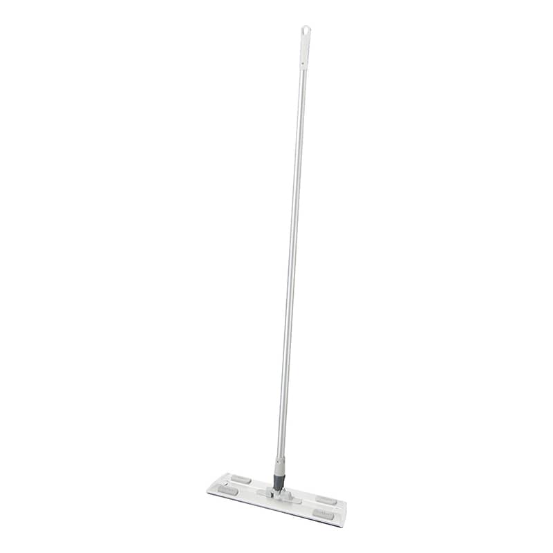 薄型アルミプレート採用でスムーズな作業をサポート。低重心薄型タイプのダスターモップ。簡単にクロスを装着できるワニ口クリップ採用。ハンドルロックを切り替えることで、プレートの横方向のふらつきが抑えられ、広い範囲でも楽に作業することができます。またハンドルをフリーにすることで前後左右180度倒すことができるため、せまいスペースも手際よく清掃できます。幅約10cm、高さ約5cmのスキマに入ります。床に接地する部分にクッション性のある素材を使用。床面にもフィットしてホコリをスムーズに除去します。●適合クロス:プロテックマイクロクロスECO450(C75-13-045X-MB)ほか●重量:650g