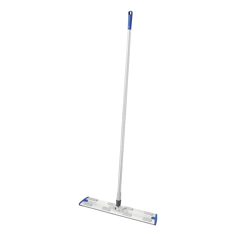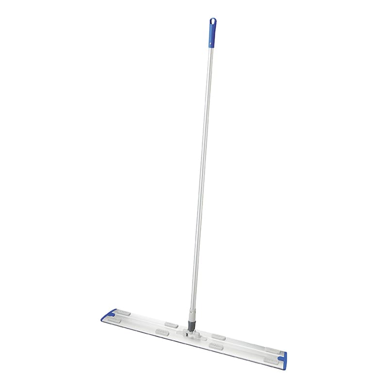 型番…DU664-090U-MB●ヘッド幅…900mm●材質…ハンドル:アルミパイプ(φ22mm)プレート:アルミクッションシート:エラストマー樹脂●全長…1420mm●色…ブルー●重量…1000g●簡単にクロスを装着できる。ワニグチクリップ。①マイクロクロスの上に本体をのせる。②ワニグチクリップにマイクロクロスを押し込むと装着完了。外す時は軽くひっぱるだけです。●ハンドルロック機構。ハンドルロックを切り替えることで、プレートの横方向のフラつきが抑えられ、広いフロアでも楽に作業できます。またハンドルをフリーにすることで前後左右180度倒すことができるため、せまいスペースも手際よく清掃できます。幅約10cm、高さ約5cmのスキマに入ります。●薄型アルミプレート採用で作業しやすい低重心設計。重心を下げたことで安定し、スムーズに動きます。また隅まで作業しやすい台形の形状です。●クッション素材で床面フィット。床に接地する部分にクッション性のある素材を使用。床面にもフィットしてホコリをスムーズに除去します。●カラ拭きも、水拭きもさまざまな用途のクロスに対応。●※クロス・ファイバーパッドは別売です。