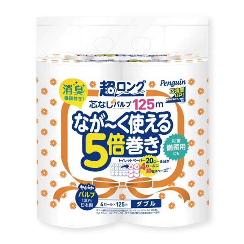 丸富製紙 トイレットペーパー ペンギン 超ロング パルプ 5倍巻き シングル 4ロール/パック