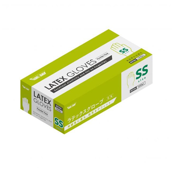 ●柔らかくしなやかでフィット性に優れています。●濡れたままでも滑りにくい指先エンボス仕様です。●サイズ:SS●入数:1箱(100枚入)●材質:ラテックス(装着側/クロリネーション)●指先エンボス加工●左右兼用●全長:240mm●厚み:0.08mm(掌部)●箱サイズ:220×110×68mm●パウダーフリー●ケース入数量:10箱入※1箱あたりの価格です。●使用期限:製造日より3年●こちらの商品は事業者様向け商品です。