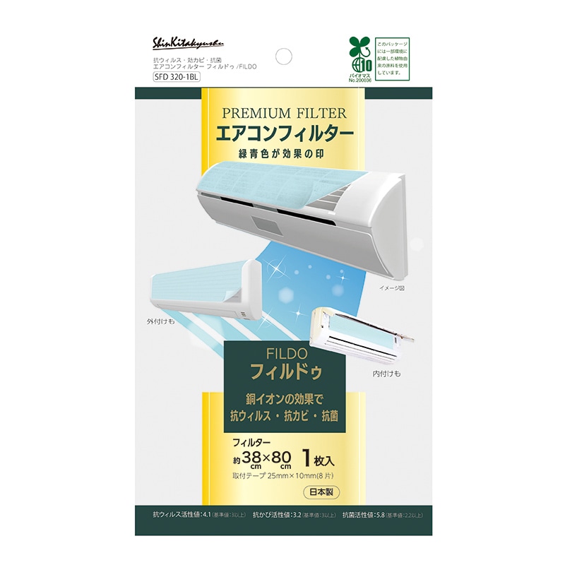 各種性能試験をクリアした、銅イオンの効果による抗ウィルス、抗菌、抗カビ機能を有した機能性家庭用エアコンフィルターです。緑青色が効果の印。●取付テープ12片付き●入数:2枚