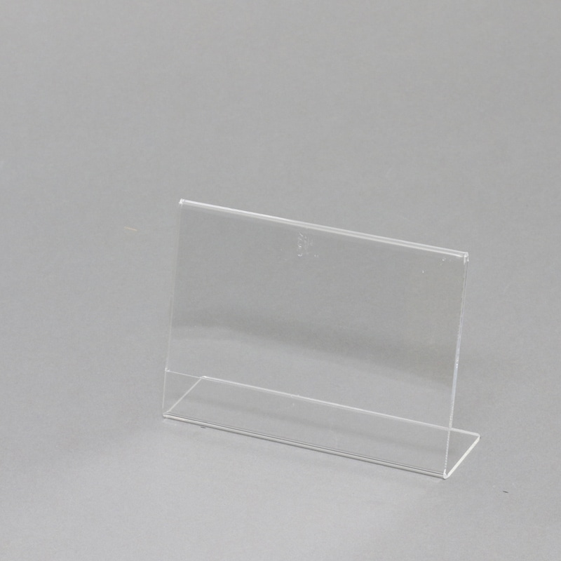 透明L型カード立て商品です。サイズはH58mm×W86mm×D30mm、カード-H55mm×W85mmです。傾斜がついて見やすいL型です。1袋10個入りです。PET樹脂素材(1mm厚)で透明感があります、焼却しても有害ガスが出ない、地球にやさしいペット素材です。ショーカード入りとなっており、ご購入後すぐご使用頂けます。またショーカードは単品でも販売しています。小売店・販売会・フリーマーケットで案内版・プライスカード・メニューなどアピールしたい印刷物を差し込んでカードスタンドとして使用して頂くのに最適です。またサイズ違いの商品も取り扱いしています。●ショーカード入