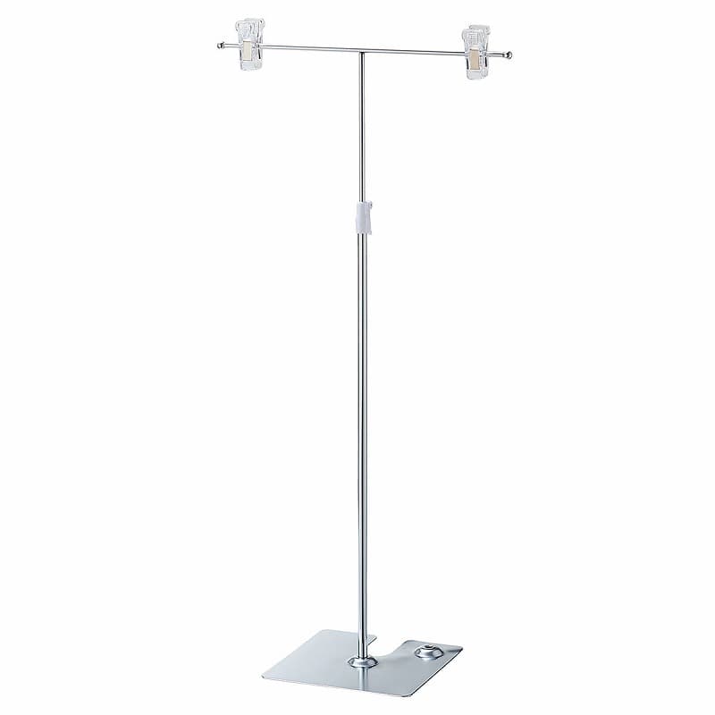 両面にポップを掲示できるT型の卓上スタンド。ワンタッチレバーで高さ調整可能です。クリップは取り外し可能。ポップに合わせて位置を調整できます。完成品のため組み立ての手間いらずで省力化に貢献します。●5mm厚までのポップをご使用いただけます。お届け時には支柱はコーナーについています。センターへの付け替えが可能です。