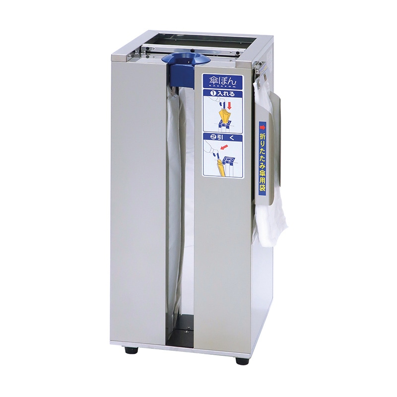 濡れた傘を片手でかさ袋へ収納できる機械です。上から傘を入れて手前に引くだけでスピーディーに装着できるので、お客様の流れを止めません。スリムタイプの傘ぽんに傘袋回収機が付いたタイプです。片手で簡単にかさ袋を取り外せ、かさ袋以外のゴミが捨てられるのを防ぎます。600枚の長傘専用かさ袋、600枚の折りたたみ傘専用かさ袋が収納できます。●傘袋回収容量:約30リットル●付属品:長傘専用かさ袋400枚/折りたたみ傘専用かさ袋200枚/インフォメーションボード:1枚(ビス2個付)/キャスター:1組(2個)/取扱説明書(保証書付)