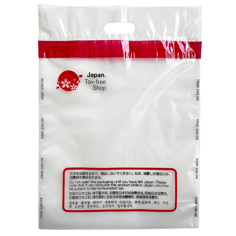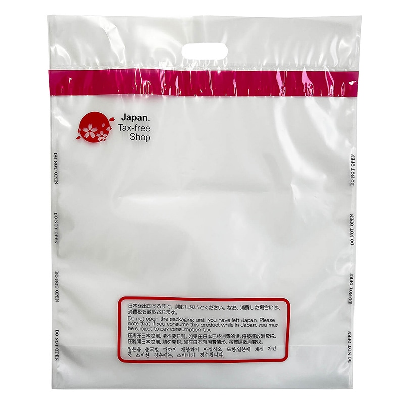 免税対象商品を販売する際に使用する、持ち帰り用の手提げポリ袋です。底マチ付き。国土交通大臣及び経済産業大臣が指定する仕様を満たしております。剥がすと、「OPEN VOID」の文字が浮き出るセキュリティテープが付いた、改ざん防止機能付き。包装・封緘後、そのまま手渡しができます。持ち手のハンドルがついてるため、持ち運びしやすく、透明なので中の商品が見えます。また、柔らかく伸びる素材で突起物に対しても耐久性があります。剥がしたテープを再度貼り付けても、「OPEN VOID」の文字が残ります。赤テープの上部から、中に商品を入れることができます。赤テープには離型フィルムがついており、商品を中に入れ、離型フィルムを剥がすと強粘着テープで後部を留めることができます。●入数:30枚