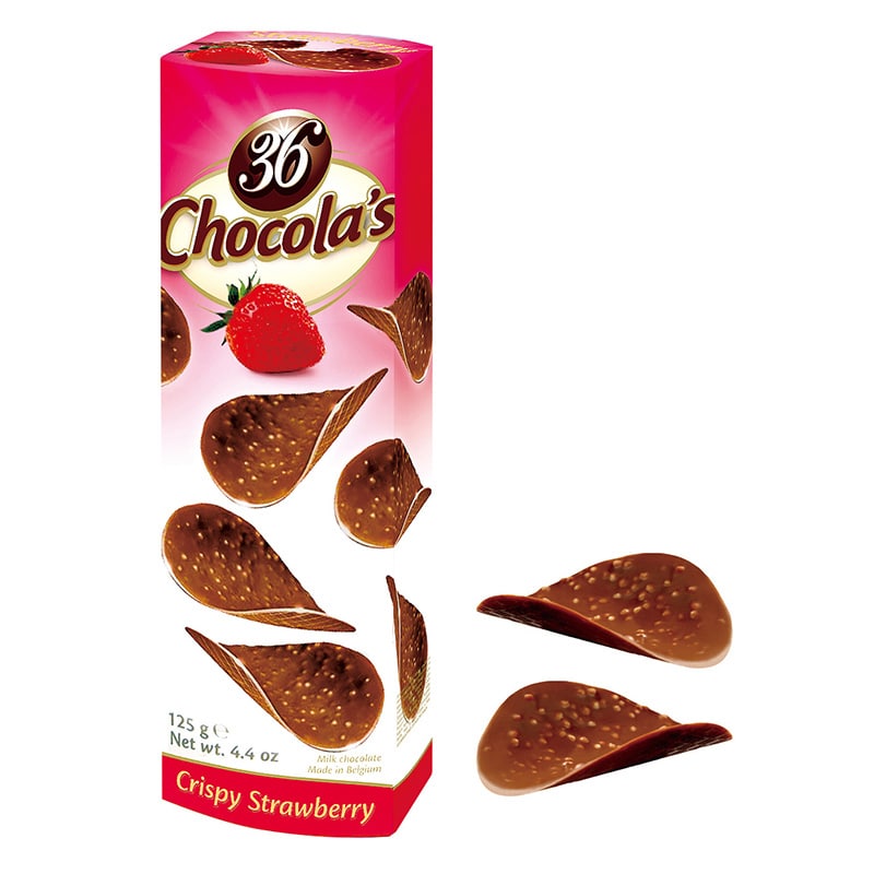 チョコレートを薄く伸ばし、そのままカールさせたチョコチップス。サクサクとした食感のクリスプが織りなす新食感をお楽しみください。甘~いストロベリーフレーバーのミルクチョコレート。