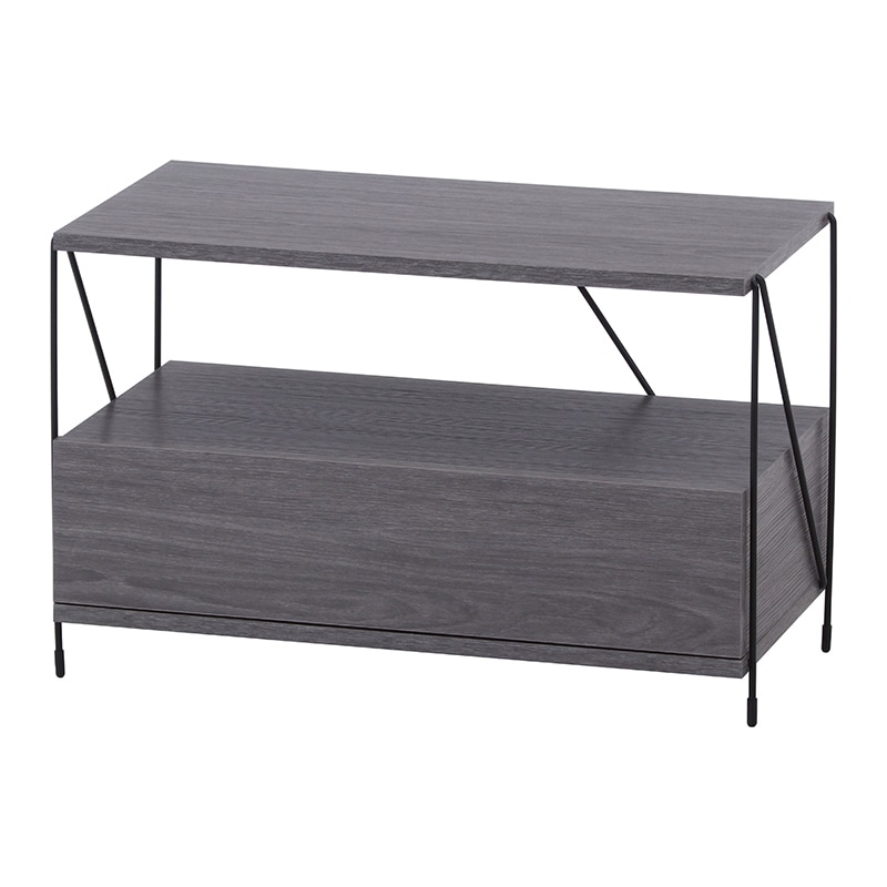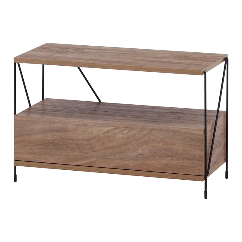 木目調の棚板とブラックスチールのワイヤーフレームで、空間をカッコよく見せてくれます。棚板の穴にワイヤーフレームを差し込むだけで完成する「ワイヤーロックシステム」を採用したシリーズで、手軽におしゃれなインテリアを楽しめます。オープン収納部分にはAV機器やお気に入りの小物などをディスプレイできます。内寸幅52×奥行23.5×高さ9.5cmの引き出しがついているので、DVDやリビング小物などを隠して収納できます。オープンボードでAV機器などの熱もこもりにくく、配線にも困りません。幅61×奥行31cmとコンパクトでワンルームでも使いやすいサイズ感です。●表面材(棚板):プリント紙化粧パーティクルボード●重量:10.8kg●お客様組立品