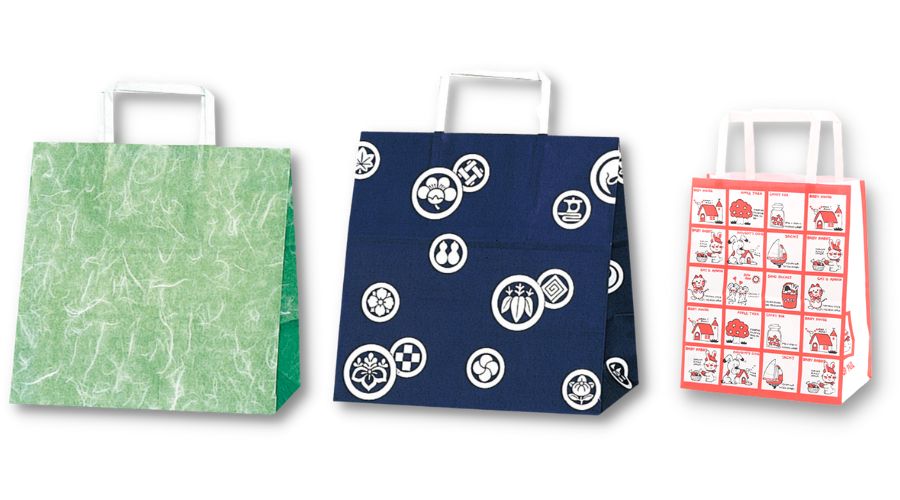 無地などシンプルなものから、様々な業種に対応した柄入りの紙袋まで豊富な種類があります。落ち着いた色の無地や和柄、洋風な柄など商品や用途に合わせて選んでみてはいかがでしょうか。大きなサイズもあるので、服なども入ります。