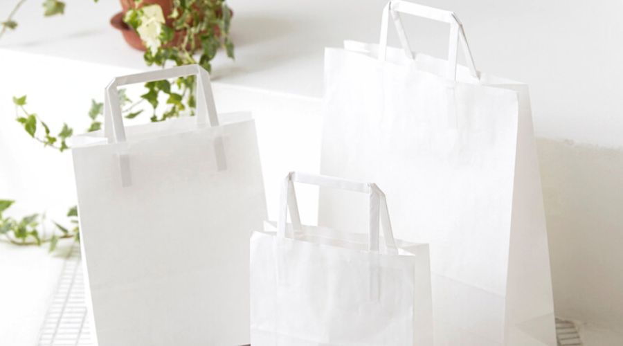 Eタイプなど底マチの広いものは、お弁当などのテイクアウトにおすすめ。持ち手が平ら(平紐)なので、手に優しく、持ちやすいのも特徴です。白無地や未晒無地(茶色のクラフト)などシンプルな紙袋がおすすめです。