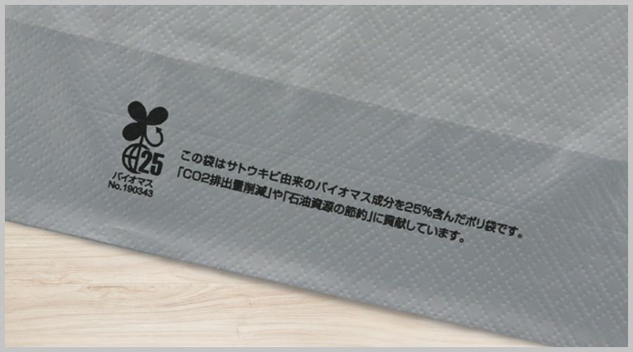 植物由来の有機資源を原料としているバイオマス素材の製品は、石油化学由来の原料から作られる製品と比較すると大幅な二酸化炭素の削減に貢献します。バイオマスを25%以上配合しているポリ袋は有償化対象外のため、無償でお客様へお渡しすることが可能です。