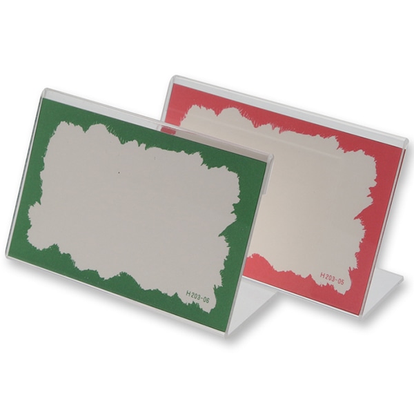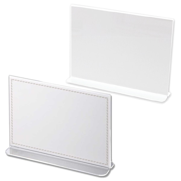 T字型のカードスタンドは、Tの字を逆さまにした形状です。縦長、横長それぞれのデザインをご用意しております。安定感があり、倒れにくいことが特長です。メニューやお知らせポップにおすすめです。