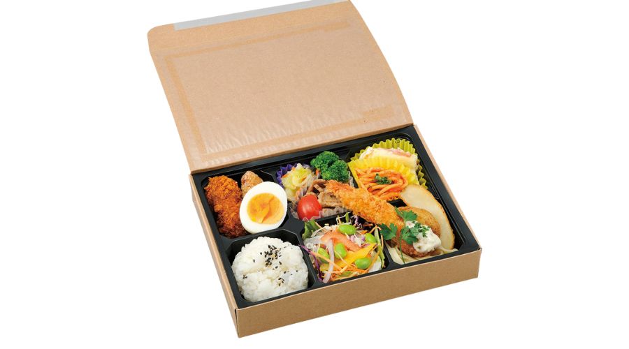 紙製の弁当容器は一般的に、外箱のみが紙製になっていることが多いです。紙製で環境にやさしく、注目のシリーズです。紙製の箱は折りたたみが可能で、少ないスペースで在庫をすることが可能です。また、お店の名前やロゴを箱に印刷することで認知度アップにもつながります。