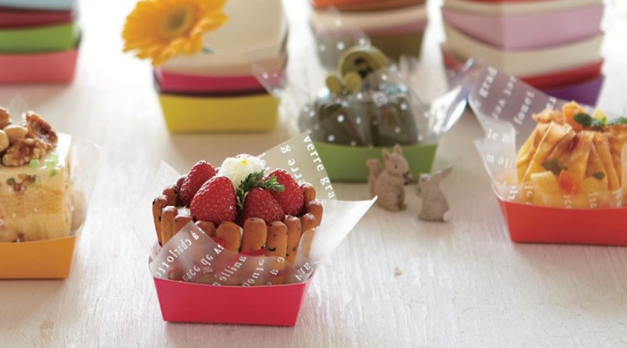 ケーキや焼き菓子の提供に使用されます。形状やデザインが豊富なため、お店の雰囲気やケーキの特徴に合わせて選ぶことができます。また、トレー自体に安定感があるためお持ち帰りの際にも便利なアイテムです。