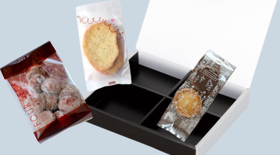 スノーボールクッキーやショートブレッドなど、球状のお菓子や厚みのあるものをいくつかまとめて袋詰めする方には、仕切の少ない箱がおすすめです。