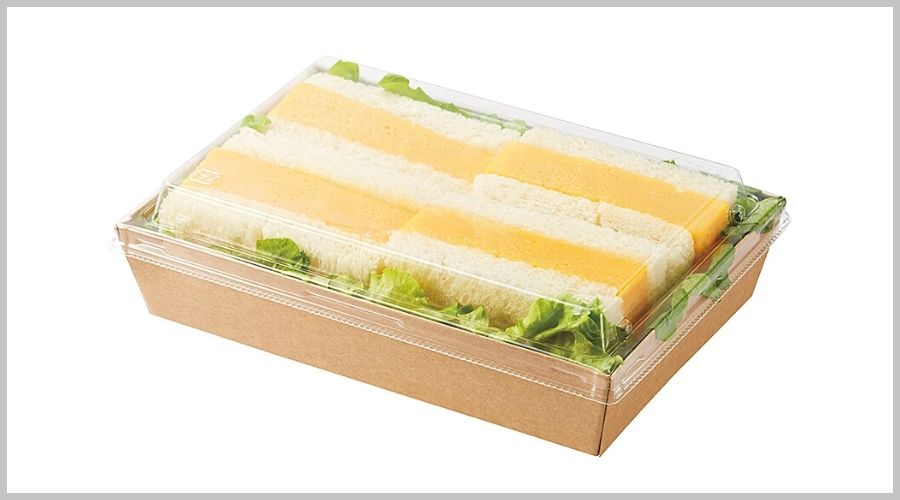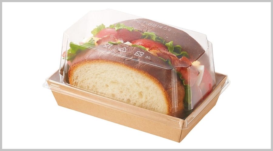透明蓋を組み合わせることで、中身が見えて魅力的なテイクアウト容器となります。蓋に高さのあるものを使用すれば、サンドイッチなど立体的な商品を包むのにも楽々。