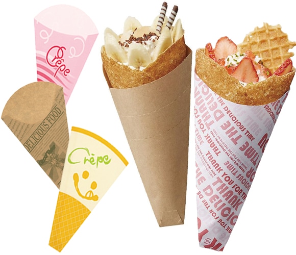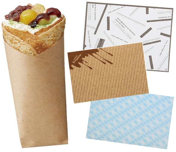 手に持って食べる事が前提のクレープにとって、クレープ袋・クレープ包装紙はお皿替わりとも言える大切なもの。お年寄りから小さなお子様まで全てのお客様に、手やお洋服を汚すことなく安心してクレープを楽しんでいただくために、クレープ袋選びにもこだわりたいものです。注文したクレープを受け取る時、クレープ袋が可愛かったりクレープとマッチしていたら、それだけでもお客様のテンションは上がる事でしょう。形や色、デザインだけでなく、ミシン目が入って食べやすくなっていたり、フルーツやアイスクリームなどの水気にも強い素材が使われていたりと独自の進化を遂げています。クレープを楽しむためには、無くてならないクレープ袋。ただでさえ美味しいクレープをもっと楽しんで頂くために、クレープ袋にもこだわってみてはいかがでしょうか。