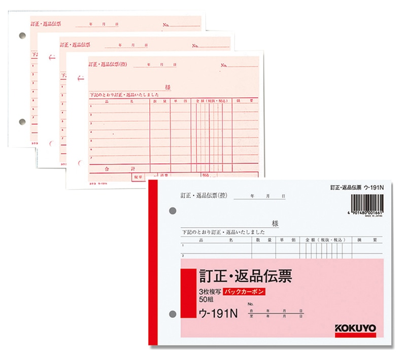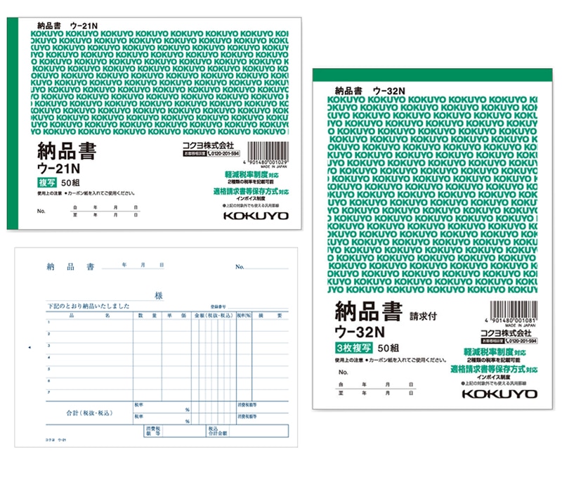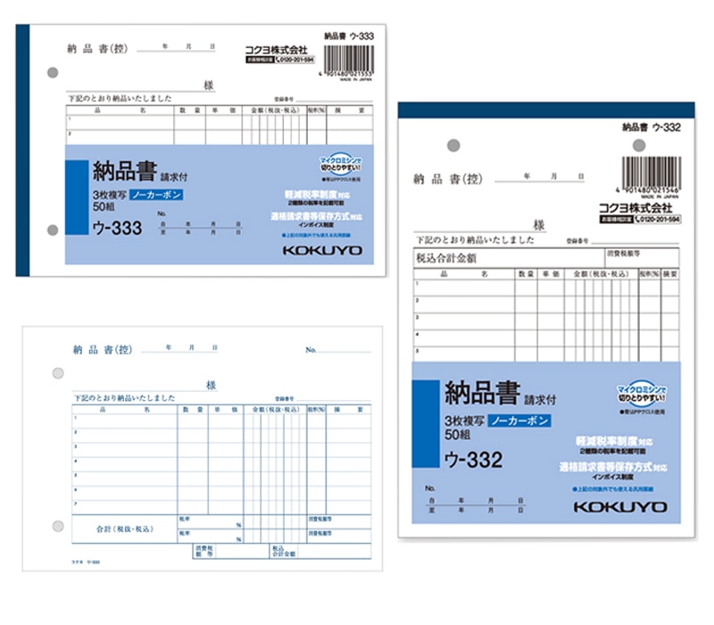 納品書の細部に注目してみるとそれぞれに特徴があり、目的に合ったものを選ぶことで日々の業務の効率アップにつながります。多くの場合「複写式」が使われていますが、複写できる枚数には差があります。2から4枚複写など必要性に応じて選びましょう。さらに複写用紙にはノーカーボン紙・裏カーボン紙・カーボン紙自体が別途必要なものなど数種類あります。伝票発行機などで印字する場合は製本されていないものの方が切り離す手間を省け、ファイリングする場合にはパンチ穴があるものが便利です。ミシン目の切り離し易さにこだわったものもあります。2023年10月1日からインボイス制度が導入されるため、軽減税率制度・適格請求書等保存方式に対応した様式のものを今のうちから使っておくのもよいでしょう。