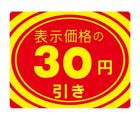 30円引きや50円引きなど、値引き額が具体的に書かれた値引きシールです。値引きの金額が具体的なので、値引き金額が計算しやすく、わかりやすいアピールに便利です。