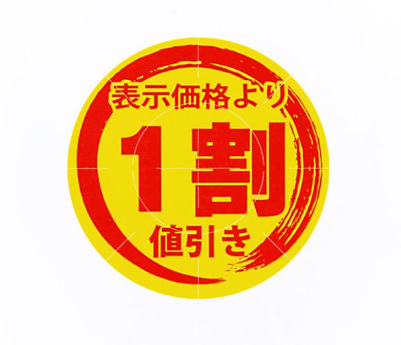1割引き、3割引きなど、値引きが割引率で書かれた値引きシールです。スーパーなどで使いやすい値引きシールです。