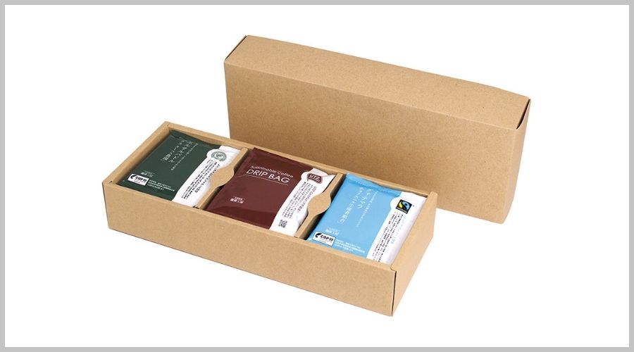 内側に仕切りが設けられており、ドリップバッグを個別に整理して収納できます。種類ごとに分けることができ、より整頓された印象を与えます。店頭見本として提示する際にも使える便利なギフトボックスです。