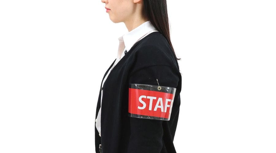 腕につけて周囲に自身の役割を示すことのできる腕章。多くの人が集まる展示会においては、とても重要なグッズです。「STAFF」や「案内係」、撮影が禁止されている展示会などにおいては「取材」や「報道」といった腕章をつけると誰が見てもわかりやすいですね。