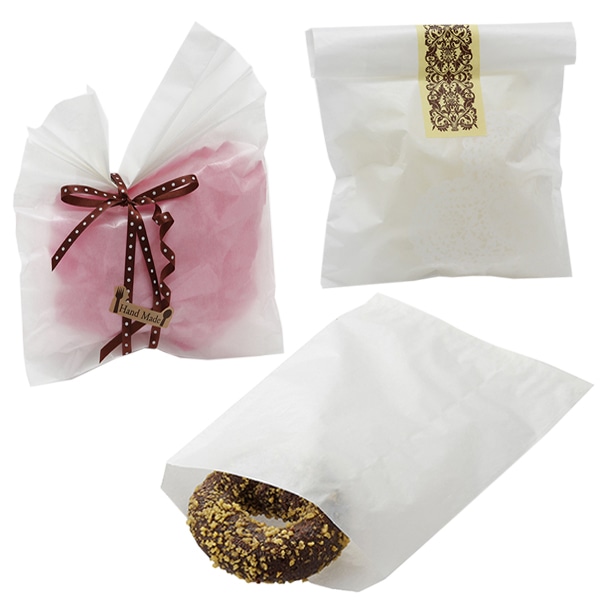 グラシン袋は、OPP袋よりも透明度が低いためナチュラルでどこか懐かしさを感じさせる風合いが人気で、独自の透け感を生かして一歩先のお洒落さを表現することができるのが特徴として強く印象に残ります。また、食品を詰めることができるのも特徴のひとつで、パッと目を引くようなカラフルなドーナツやアイシングクッキーなどを入れると、カメラのフィルターをかけるように、入れた物の印象を少し落ち着いたものに変えることもできます。アクセサリーや手作りのお菓子を入れて、大切な人にプレゼントする際にもお使いいただけます。機能性や素材性に優れ、変幻自在な使い方が可能ですので、ぜひあなたにピッタリのグラシン袋を選んでお使いください。