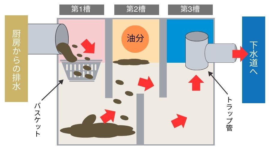 グリストラップは3槽に分かれており、それぞれ役割が異なります。