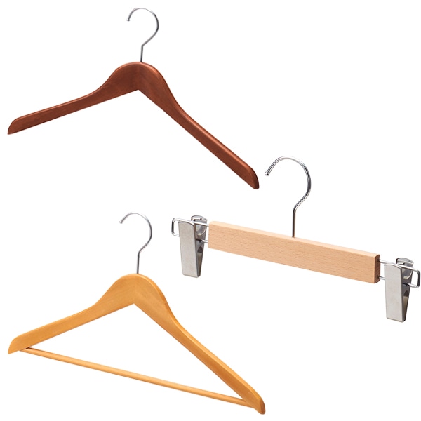 市販で扱われているハンガーの素材は主にプラスチック製、木製、金属製となっています。他には発泡ハンガーというものもあり、しっかりとした厚みに対して発泡素材特有の軽さもあるという特徴があります。素材を選ぶにはまず用途を選択し、型崩れが起きてしまったり、ハンガーから服が落ちてしまったりしないようにサイズ感を大切にして決めていくことが重要です。シモジマオンラインショップでは、アパレルショップやクリーニング店など業者様向けにハンガーの取扱をしています。