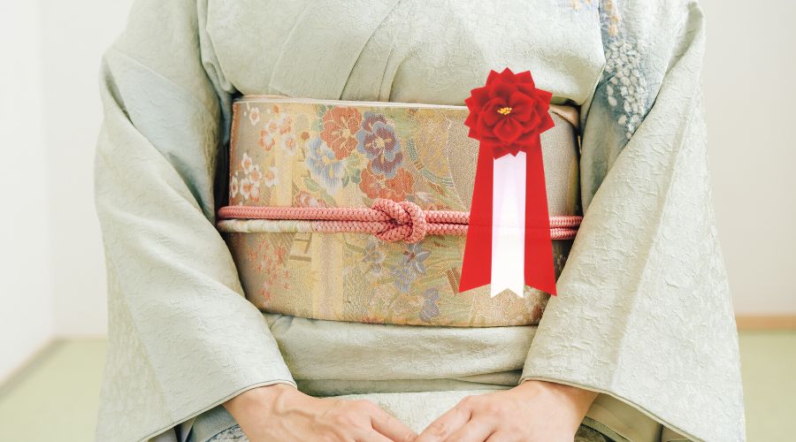 式典などの場では、和服を着用する女性も多いでしょう。和装の場合安全ピンですと、布地を傷めることが多いため、帯揚げに安全ピンで付けるか、クリップで帯に留めてください。