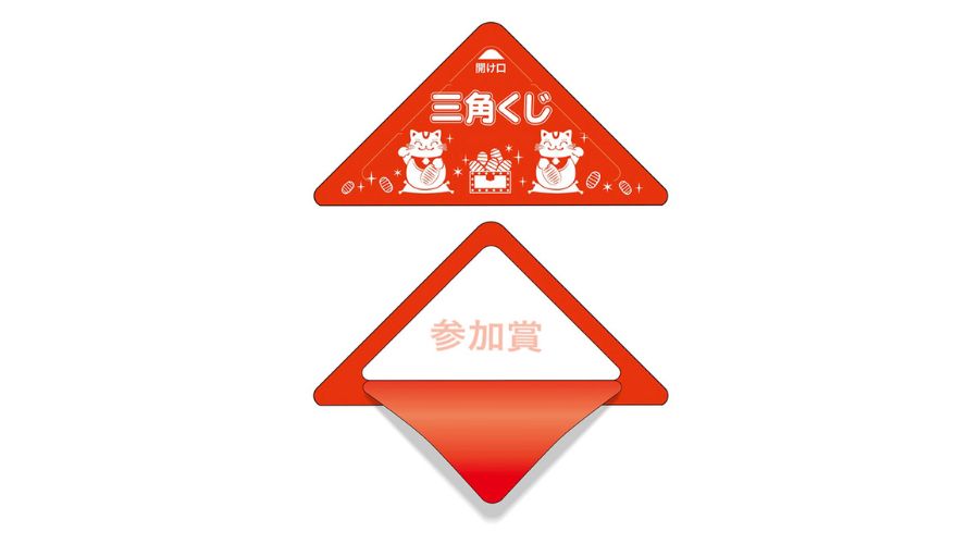 三角形の折りたたまれた紙をミシン目に沿ってはがす三角くじ。あらかじめ三角形に加工されているものと、平版になっており中身の結果を書き込めるようになっているものと2種類あります。当たりの確率を調節したい方には平版がおすすめです。