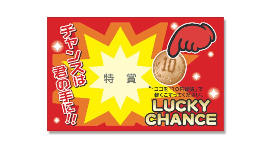 10円などの硬貨で削ると結果が見えるようになるため、その結果によって景品やサービスを受けることができるくじです。パーティーやキャンペーンなどにおすすめ。