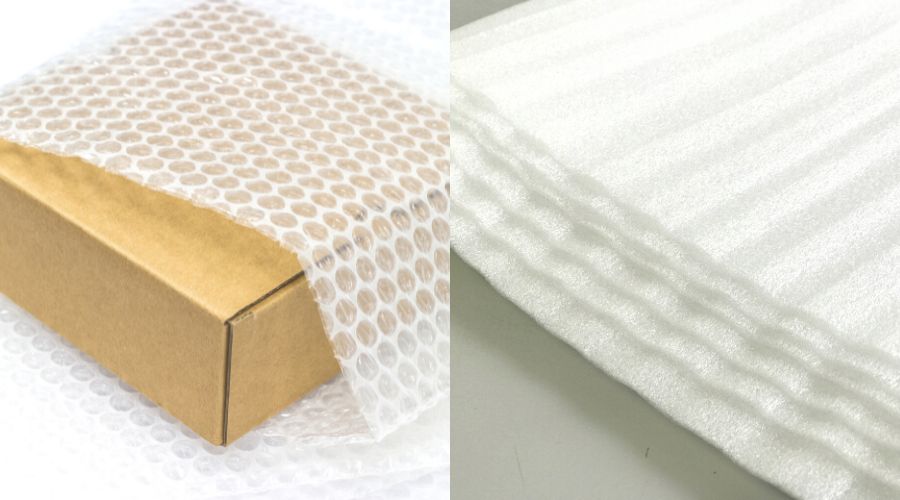 エアパッキンに比べ薄く柔らかさがあるため、小さいものや複雑な形状のものでも梱包しやすいのが特徴。断熱性と防水性があり、保冷バッグや水濡れ対策にも。耐衝撃性はエアパッキンに比べ弱いですが、商品保護に適しているため、商品の表面に傷をつけたくない方におすすめです。