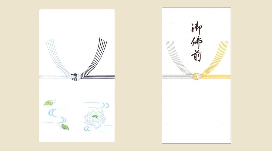 お悔みや法要などの弔事の際に使用される金封です。お香典や読経料、お車代を包む際に使用されます。二度とあってほしくないという意味の結び切りやあわび結びの水引が使用されているのが特徴です。蓮(ハス)の花の絵が描かれた袋は、仏式の際のみご使用ください。弔事では、新札やシワだらけのお札ではなく、普通のお札を用意します。お札を裏にして印刷されている人物の顔が下に来るようにのし袋に入れましょう。
