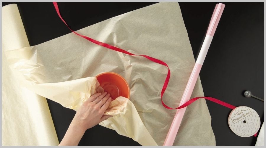 通常の包装紙でギフトボックスを包むように、薄葉紙で箱を包むのもおすすめです。柔らかい質感のため、簡単に包むことができます。薄葉紙は包装紙と比べて紙が薄く透けやすいので、色の異なる包装紙を組み合わせることでおしゃれで透けないラッピングをすることができます。