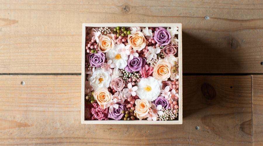 プリザーブドフラワーの鑑賞期間は、保管環境により異なりますが、目安としては1~2年くらいの間は美しい色や質感をお楽しみ頂けます。保管に最適な温度は10~25℃で、湿度は65%以下です。