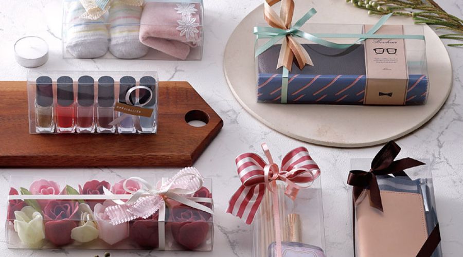 ピュアケースは、ポリ塩化ビニルといった中身が見える透明な素材で作られたギフトボックスです。クリアな見た目が商品をおしゃれに引き立て、店頭でのディスプレイにも効果的です。小さな雑貨から焼き菓子まで、多様なアイテムのラッピングに利用できます。