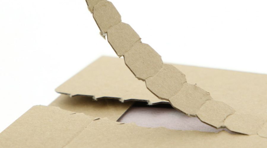 ラクポスBOXには、開封時に簡単に取り出せるよう、予めミシン目が付いています。端の切込をつまんで横に引くだけで、ラクに開けることができます。