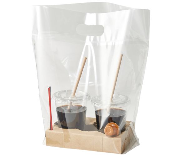 横長の手穴ポリ袋は主にケーキ屋さんなどで販売されている横長のケーキ箱を入れるためによく使われます。カフェショップでのドリンクのテイクアウトや、青果店で果物のまとめ売りにも役に立つ形状です。