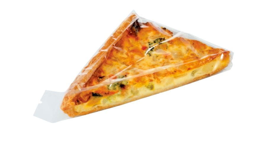 三角の形をした三角パックタイプは、ピザやパイ、ケーキ、チーズなどのピースカット販売されている食品を入れるのに重宝されています。フィルムタイプなので手と周囲を汚さずに食べることができます。