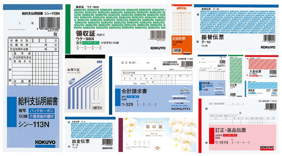 取引の際に金銭を受け取った証明のため発行する「領収書」、飲食店でオーダーを取る際に使用する「お会計票」、商品やサービスを届けた明細を記載する「納品書」、日時で売上げ金などを集計する「日計票」などがあります。 |