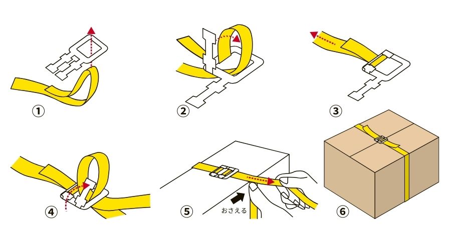 ⑤箱に巻き付けたバンドを押さえながら、バンドの端側を引っ張ります。