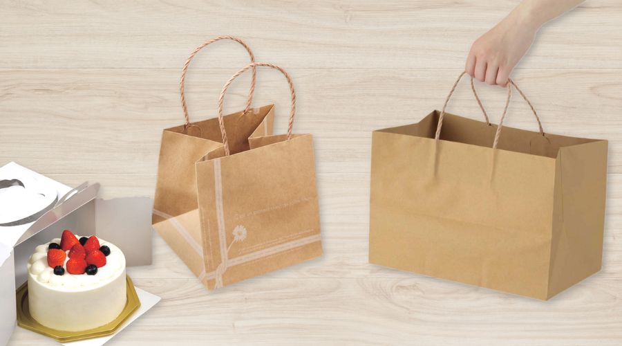 マチ広のスムースバッグは、箱ものを入れるのにおすすめです。白無地や未晒無地だけでなく、洋菓子店やベーカリーにマッチしたデザインの商品もございます。ケーキ箱に合わせて作られている商品もあるため、入れる箱の大きさをしっかり確認してから袋を選びましょう。