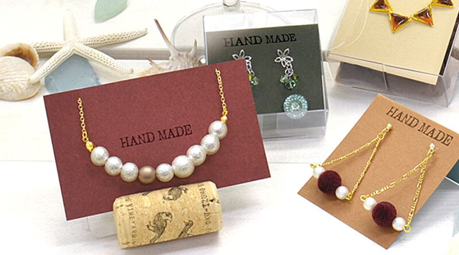 カードに穴や切り込みを入れれば、アクセサリー台紙に。手作りアクセサリーの販売に用いられます。お店のロゴをシールやスタンプでつけるのもおすすめ。