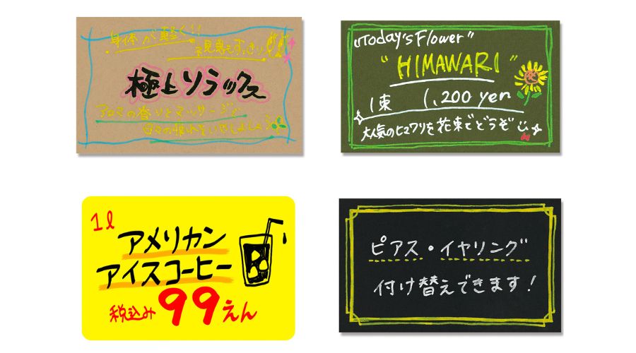 商品の価格や説明を記入し、販売促進ツールとして使えます。厚口のものなどは折れにくいので長時間の使用にもおすすめです。