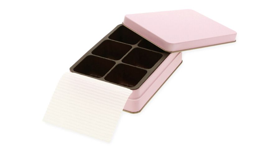 カラーバリエーションが豊富な角型缶。キャンディ缶やプティ缶など、多用途に使用できるシンプルな缶が揃っています。中に仕切りトレーを敷いてクッキーや焼き菓子を入れる容器や、紅茶やコーヒーなどラッピング容器など、丈夫なつくりを活かして様々な用途に使用できます。