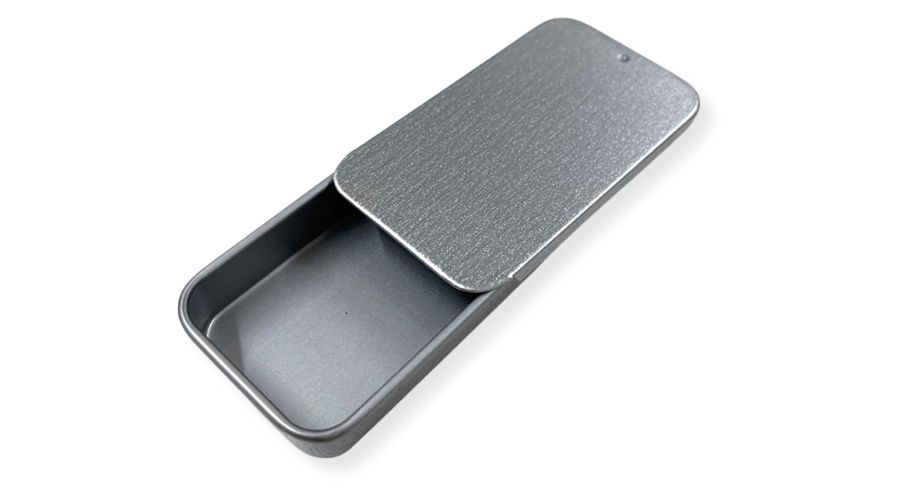スライド式に開閉できる角型缶で、手軽に開け閉めできます。スライド式なので蓋がしっかり固定され、持ち運びにも最適です。手のひらサイズなので、ヘアピンやお薬など小さく無くしがちな物の保管に。